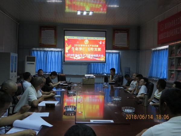2018年6月14日下午,按照川水電安全監督[2018]5號、川水電安辦[2018]6號文件精神,金堂盤龍寺攔河閘項目部組織全體管理人員、配屬作業隊負責人、生產班組成員召開安全生產月活動及學習培訓。
