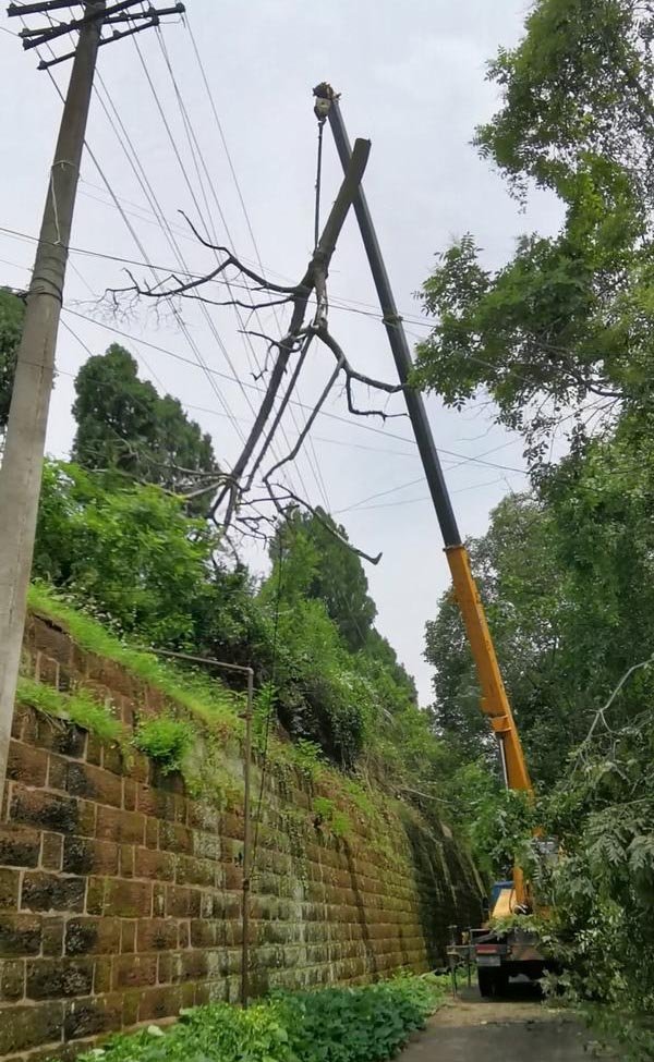 時值正午,烈日當空;雨后的地面,熱氣蒸騰;草叢中蚊蟲成團飛舞,在人的身上滿飲鮮血后,還不忘留下片片“小山包”印跡。在多名片區住戶大媽的期待眼神中,張尚明和部門人員在現場進行指揮及安全指導,參與人員忍受著腹中饑餓和蚊蟲叮咬,在機械設備協同助力下,將倒伏在電線上的枯樹平穩吊下并分解。枯樹被吊下后,對糾纏在一起的輸電線路繼續進行清理和檢查,確保送電萬無一。