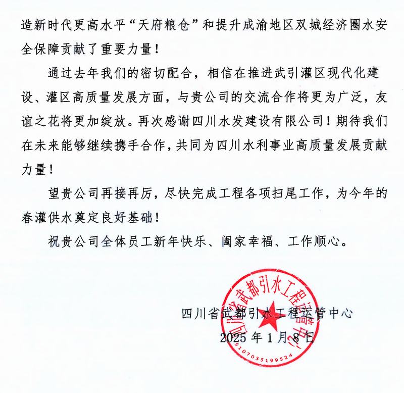 歲序更替 逐夢前行 公司收到四川省武都引水工程運營中心表揚信