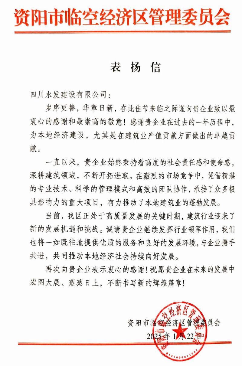 1月24日,公司收到資陽市臨空經(jīng)濟(jì)區(qū)管委會發(fā)來的表揚(yáng)信,信中對公司在2024年度為本地經(jīng)濟(jì)建設(shè),尤其是在建筑業(yè)產(chǎn)值方面的卓越貢獻(xiàn)予以充分肯定。