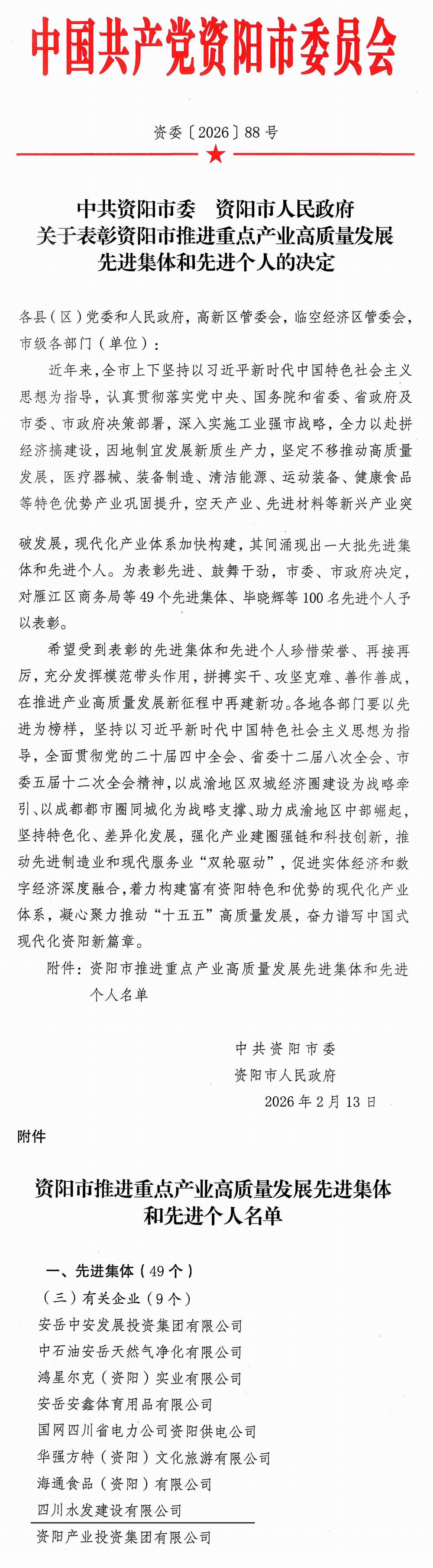 駿馬奔騰啟新章,馬年伊始,公司迎來了提振人心的又一好消息——榮獲資陽市“推進(jìn)重點(diǎn)產(chǎn)業(yè)高質(zhì)量發(fā)展先進(jìn)集體”榮譽(yù)稱號(hào)。