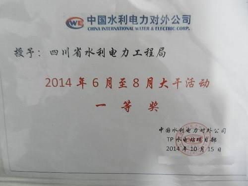 2014年10月15日,厄瓜多爾TP水電站項目部榮獲由中國水利水電對外公司TP水電站項目部組織的“大干三個月”(6月至8月)勞動競賽活動綜合評比“一等獎”,獲得勞動競賽活動獎金8000美元,并得到了業主、監理的一致好評。