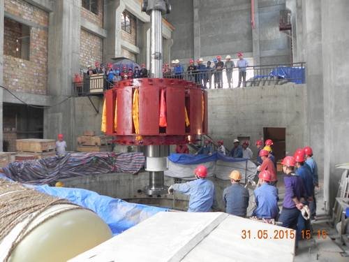 2015年5月31日15時28分,九龍峽水電站1號水輪發電機組轉子順利進入1#水輪發電機組機坑,成功吊裝就位。