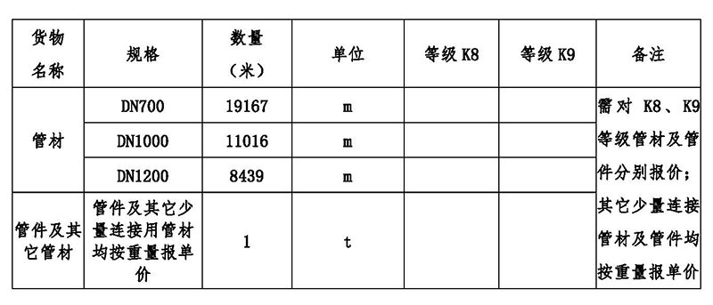 采購范圍:球墨鑄鐵管(管徑DN700-1200)及管件,總用量約38622米。采購數(shù)量以實際需求數(shù)量為準。