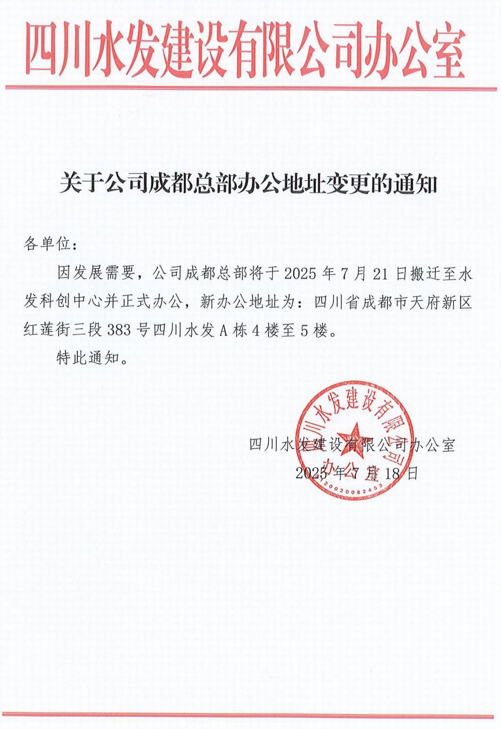 四川水發(fā)建設(shè)有限公司關(guān)于辦公地址變更的通知